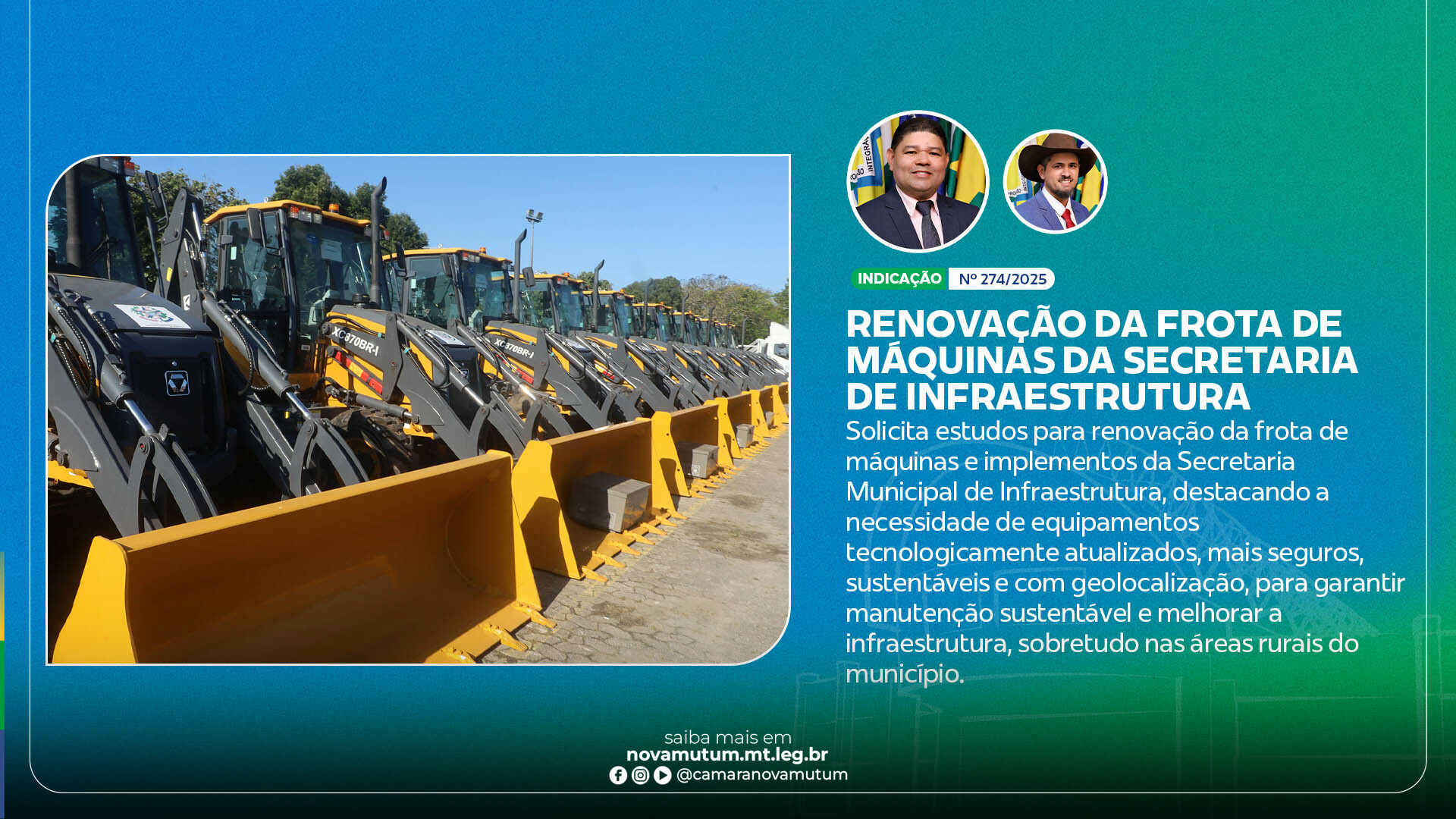 Com a aprovação da Indicação nº 274/2025, a Câmara Municipal encaminhará a sugestão ao prefeito municipal, solicitando que sejam iniciados estudos técnicos e orçamentários para viabilizar a renovação gradual dos equipamentos da Secretaria de Infraestrutura e Obras.