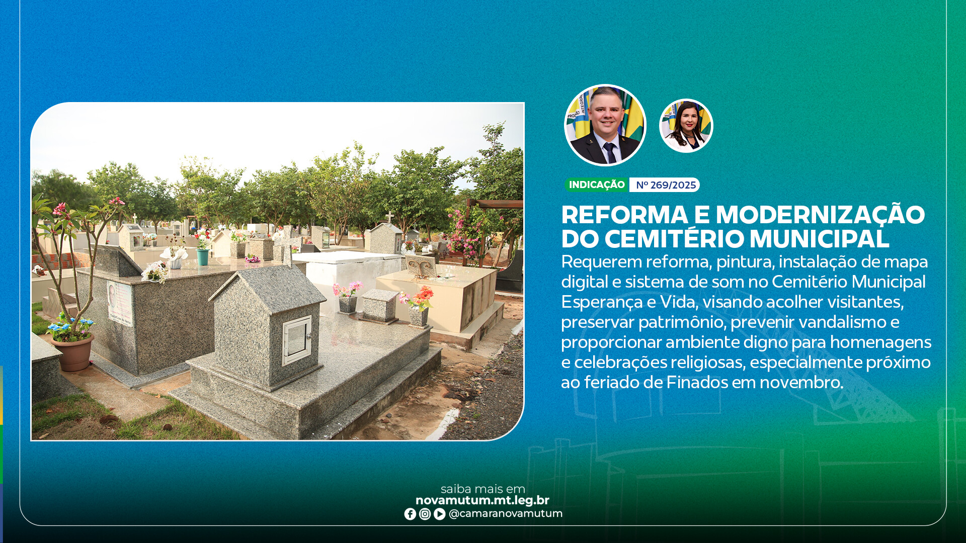 Na sessão legislativa ocorrida em 22 de setembro, os vereadores de Nova Mutum aprovaram por unanimidade a Indicação nº 269/2025, de autoria do vereador Lucas Badan Faria (União Brasil) em parceria com a vereadora Beatriz Correa (União Brasil). A iniciativa encaminha ao Executivo municipal pedido para promover a reforma estrutural e a revitalização do Cemitério Municipal Esperança e Vida, situado no perímetro urbano da cidade.