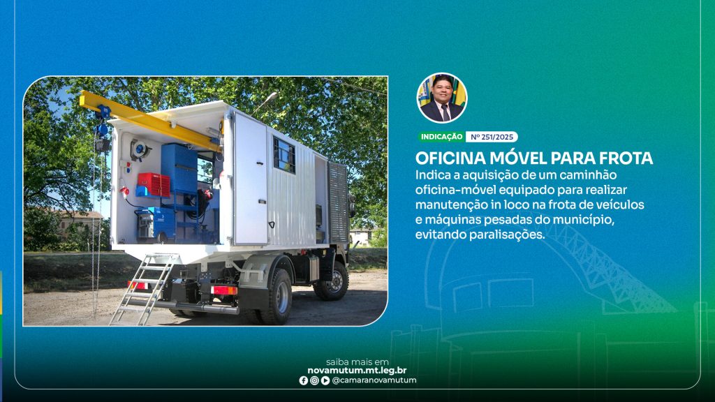 Entre as proposições destacadas está a indicação nº 251/2025, do vereador Altair Albuquerque (PP), que sugere a aquisição de um caminhão transportado oficina-móvel equipado com painéis elétricos, sistema de abastecimento de óleo e combustível e espaço para ferramentas.