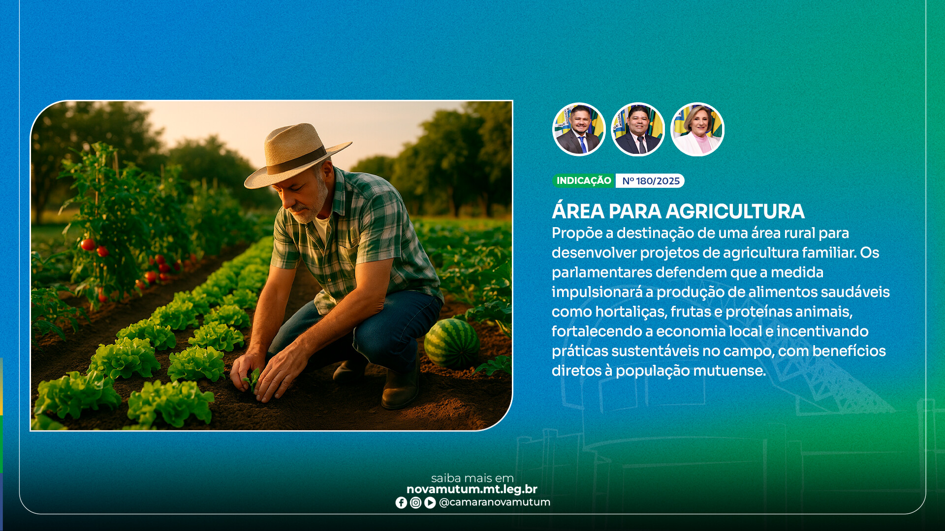 Em mais uma ação voltada ao desenvolvimento rural, a 22ª sessão ordinária da Câmara Municipal de Nova Mutum, realizada nesta segunda-feira (14), aprovou por unanimidade a Indicação nº 180/2025, que sugere a destinação de uma área rural para projetos de agricultura familiar no município. A proposta, apresentada pelos vereadores Maciel Sousa (Republicanos), Altair Albuquerque (PP) e Carmem Casagrande (UNIÃO Brasil), tem como objetivo fomentar a produção de hortaliças, frutas e proteína animal, fortalecendo a segurança alimentar e a economia local.