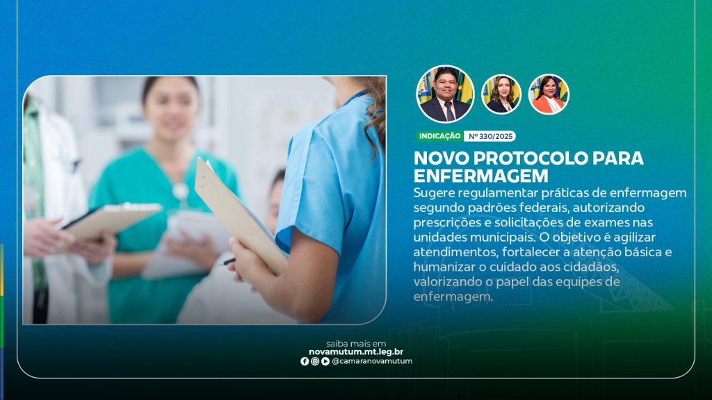 A 37ª Sessão Ordinária da Câmara Municipal de Nova Mutum, realizada nesta quarta-feira (17), aprovou por unanimidade uma proposta que pode revolucionar o atendimento na rede pública de saúde. A Indicação nº 330/2025 defende a criação e implantação do Protocolo de Enfermagem no município, seguindo padrões estabelecidos pelo Ministério da Saúde e pelo Conselho Federal de Enfermagem (COFEN). A medida, de autoria do vereador Altair Albuquerque (PP) e com coautoria das vereadoras Jaiane Santos (PP) e Lurdes Costa Marques (REPUBLICANOS), tem como objetivo principal agilizar e qualificar o serviço prestado à população.