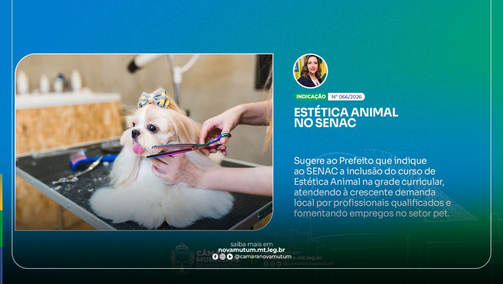A proposta nasce de uma lacuna identificada no mercado local. Nova Mutum registra alta procura por serviços de estética animal, mas enfrenta escassez de profissionais capacitados para atender essa demanda crescente. A indicação aponta que o SENAC já desempenha papel relevante na formação profissional da cidade, e que ampliar sua oferta de cursos para essa área seria um passo natural e estratégico.