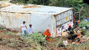 Um caminhão carregado com carne tombou na tarde desse sábado (28), na Serra do Mangaval, localizada na BR-070, em Mato Grosso. Segundo o Corpo de Bombeiros Militar de Mato Grosso (CBMMT), que atendeu a ocorrência, um casal, sendo um homem de 41 anos e uma mulher de 37, ficou ferido e foi encaminhado ao Hospital Regional de Cáceres (a 220 km de Cuiabá).