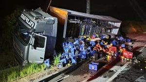 A concessionária Nova Rota do Oeste foi acionada na noite desta quarta-feira (14), às 23h39, após um caminhão Volvo FH 440, carregado com garrafas de cerveja, sair da pista e tombar na faixa de domínio no km 770 da BR-163, no município de Sorriso/MT. De acordo com as informações repassadas pela concessionária, o veículo seguia pela rodovia quando, por razões que ainda serão apuradas, o condutor perdeu o controle da direção, fazendo com que o caminhão deixasse a pista e tombasse às margens da rodovia. Parte da carga transportada acabou se espalhando pela faixa de domínio e pelo acostamento.