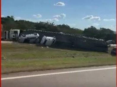 Carga ficou espalhada em canteiro de rodovia Uma carreta cegonha tombou na BR-364 nesta sexta-feira (24) e espalhou a carga com nove carros e duas