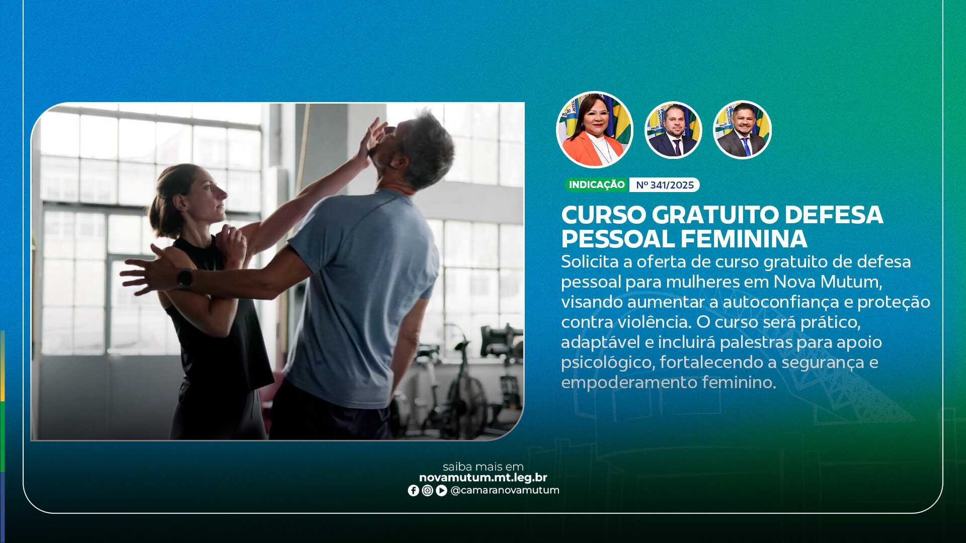 A Câmara de Vereadores de Nova Mutum aprovou por unanimidade, durante a 38ª sessão ordinária realizada na segunda-feira, 24 de novembro, a Indicação nº 341/2025, que sugere ao Poder Executivo a criação de um curso gratuito de defesa pessoal feminina no município. A proposta foi apresentada pela vereadora Lurdes Costa Marques (Republicanos), com coautoria dos vereadores Anderson Mantovan (União Brasil) e Maciel Sousa (Republicanos). Como ocorre com todas as indicações, a implementação dependerá da análise de viabilidade por parte do Executivo, que avaliará sua execução conforme o interesse público.