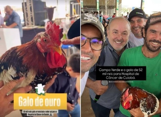 “Começou o leilão no galo. Duas pessoas compraram e doaram de novo. Eu comecei a pedir para o pessoal comprar e doar, comprar e doar… No final, o galo deu R$ 52 mil. Ficou batizado de Galo de Ouro. Todo ano vai ter o Galo de Ouro aqui em Campo Verde”, declarou Barcelos.