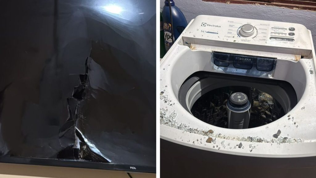 Durante o ataque, o suspeito quebrou a TV, empurrou a mulher ao chão e, logo depois, saiu para a área externa da residência, onde destruiu a tampa de vidro da máquina de lavar. Antes de fugir, ele ainda a ofendeu com palavras de baixo calão, chamando-a de “vagabunda” e “prostituta”.