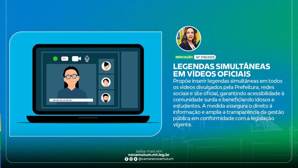 A Câmara Municipal de Nova Mutum aprovou por unanimidade, durante a sessão ordinária realizada na última segunda-feira, 6 de outubro, a Indicação nº 278/2025, de autoria da vereadora Jaiane Santos (PP). A proposta sugere ao Poder Executivo Municipal que determine aos setores competentes a inserção de legendas simultâneas em todos os vídeos produzidos e divulgados pelos órgãos da Administração Pública Municipal, incluindo redes sociais, site oficial, transmissões ao vivo e demais plataformas de comunicação da Prefeitura de Nova Mutum.