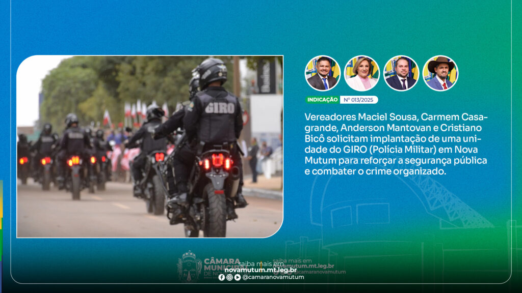 Os vereadores Maciel Sousa (Republicanos), Carmem Casagrande (União Brasil), Anderson Mantovan (União Brasil) e Cristiano Bicô (Republicanos) apresentaram a Indicação nº 013/2025, sugerindo ao prefeito municipal a implantação de uma unidade do GIRO – Grupo de Intervenção Rápida Ostensiva da Polícia Militar de Mato Grosso – no município de Nova Mutum.