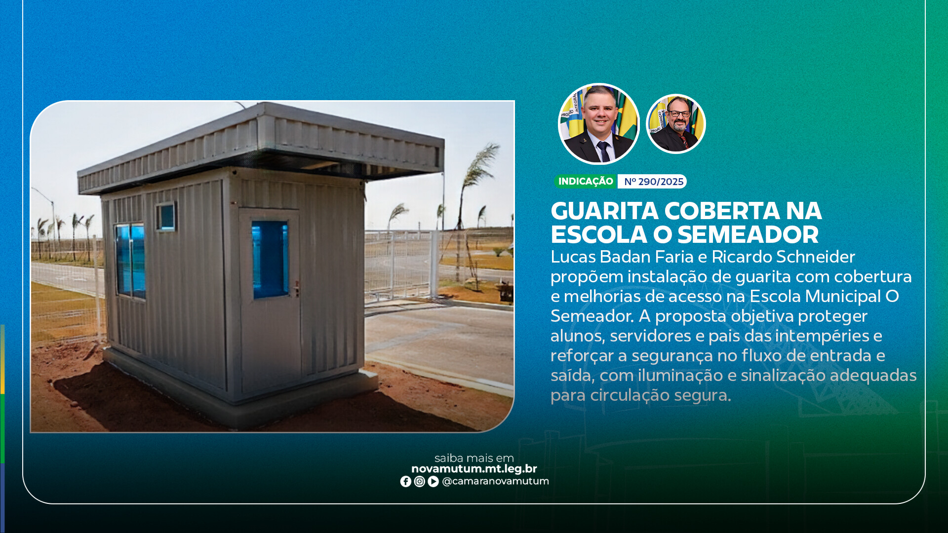 Em mais uma demonstração de atenção às necessidades da comunidade escolar, a Câmara Municipal de Nova Mutum aprovou por unanimidade durante a 32ª Sessão Ordinária a Indicação nº 290/2025, de autoria do vereador Lucas Badan Faria (UNIÃO BRASIL) com coautoria do vereador Ricardo Schneider (PL). A matéria propõe a instalação de uma guarita com cobertura que proporcione proteção adequada desde o portão de acesso até o ginásio da Escola Municipal O Semeador.