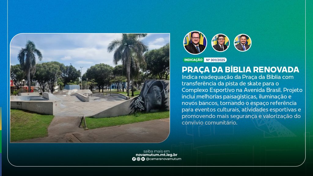 Com o intuito de aprimorar os espaços públicos e oferecer maior segurança, funcionalidade e bem-estar à comunidade, o vereador Rafael Brignoni (PL), com o apoio dos vereadores José da Paixão (UNIÃO BRASIL) e Maciel Sousa (Republicanos), apresentou a Indicação nº 301/2025, que propõe à Prefeitura Municipal de Nova Mutum a readequação da Praça da Bíblia e a transferência da pista de skate para o Complexo Esportivo da Avenida Brasil, integrando-a à futura área destinada à prática esportiva.