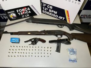 Pai e filho foram detidos pela Polícia Militar de Sorriso, por meio da equipe da Força Tática, na noite desta segunda-feira (15/12), após a apreensão de armas de fogo, um simulacro e diversas munições. A ação teve início após denúncias anônimas informarem que armamentos estavam sendo exibidos em postagens nas redes sociais.