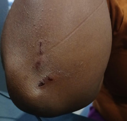A mulher sofreu um ferimento no cotovelo direito e uma lesão no antebraço esquerdo.