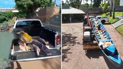 Os suspeitos estavam em duas canoas artesanais, cada uma transportando caixas de geladeira adaptadas como térmicas. Na abordagem, os policiais encontraram um total de 1.086 kg pescado, incluindo espécies proibidas nesta época do ano, como dourado, pacu, pintado, cachara e jaú