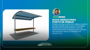 O vereador Baguncinha (PP) apresentou a Indicação nº 325/2025, propondo ao Excelentíssimo Prefeito Municipal a reforma e reestruturação do abrigo de ônibus localizado na MT-235 (Rodovia da Produção), no trevo que dá acesso à Comunidade Ranchão, em Nova Mutum.