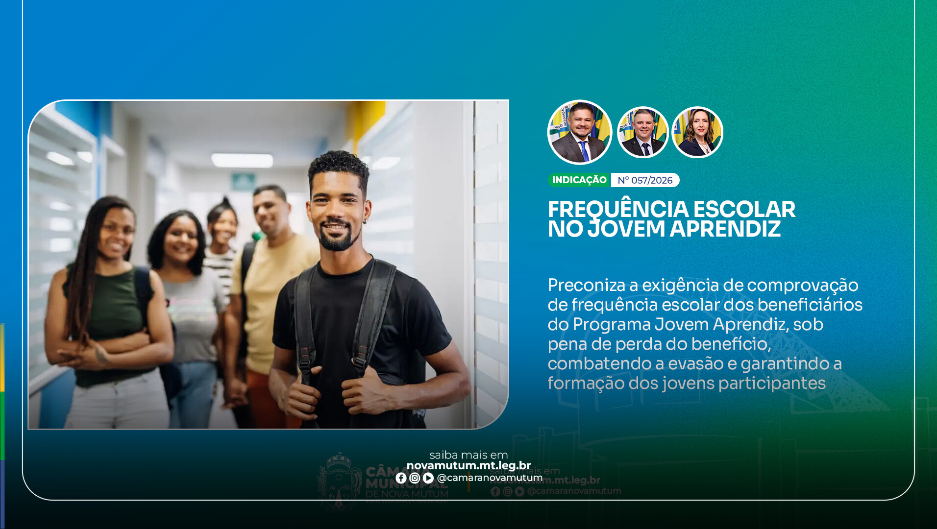 A Câmara de Vereadores de Nova Mutum atua, por meio dessa indicação, na promoção de políticas públicas que unem educação, inclusão social e responsabilidade.