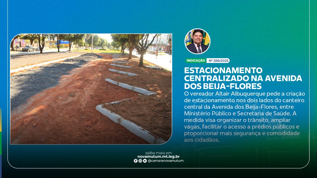 No contexto da 32ª Sessão Ordinária da Câmara Municipal de Nova Mutum, realizada nesta quarta-feira (15), foi apresentada a Indicação nº 289/2025, de autoria do vereador Altair Albuquerque (PP). O documento endereçado ao Poder Executivo municipal destaca a necessidade de implantar estacionamento em ambos os lados do canteiro central da Avenida dos Beija-Flores, em um trecho que se estende desde o prédio do Ministério Público, na Rua das Seringueiras, até a nova sede da Secretaria de Saúde, na Avenida das Arapongas.