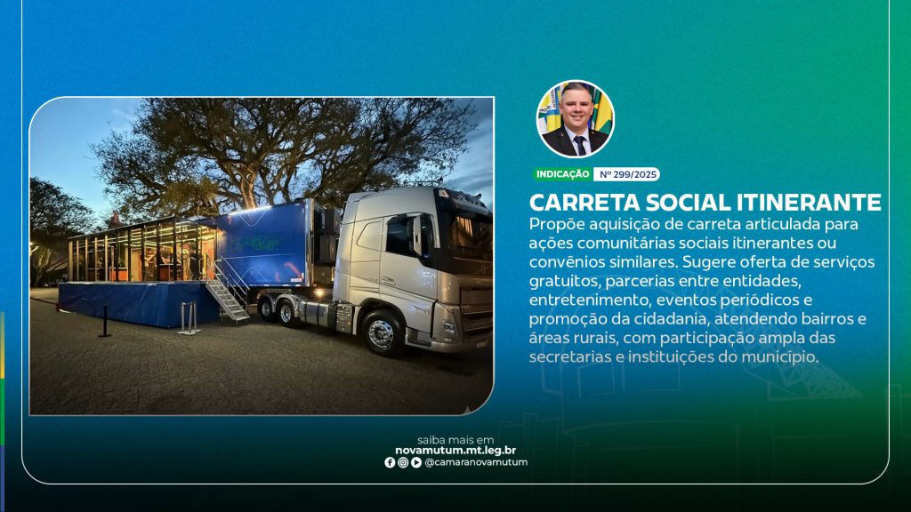 Buscando ampliar o acesso da população aos serviços públicos e fortalecer as ações comunitárias no município, foi aprovada por unanimidade, na 33ª sessão ordinária da Câmara de Nova Mutum, a Indicação nº 299/2025, apresentada pelo vereador Lucas Badan Faria (União Brasil). A proposta sugere à Prefeitura a aquisição de uma carreta articulada — ou a celebração de convênios com entidades públicas e privadas — para promover atendimentos itinerantes em diversos bairros e áreas rurais, como o Distrito Ranchão e o Pontal do Marape.