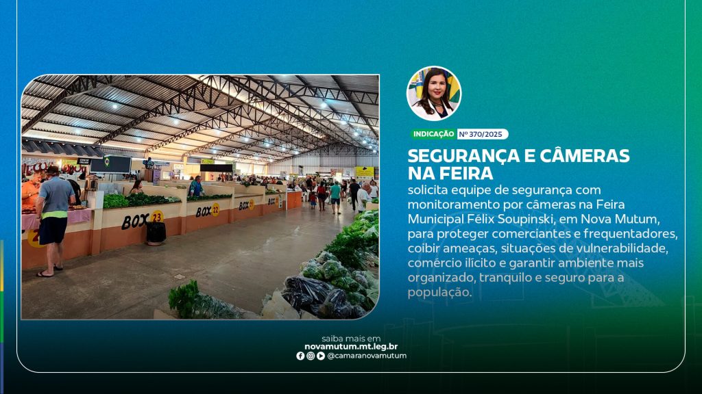 A indicação é de autoria da vereadora Beatriz Correa (UNIÃO BRASIL) e solicita ao Poder Executivo Municipal a disponibilização de uma equipe de segurança para atuar de forma permanente no espaço da feira.