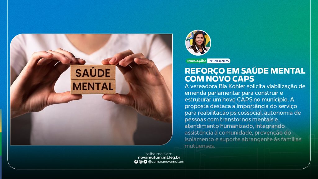 Em sessão ordinária realizada nesta quarta-feira (15), a Câmara Municipal de Nova Mutum aprovou, por unanimidade, a Indicação nº 283/2025, de autoria da vereadora Bia Kohler (UNIÃO BRASIL). O documento solicita ao Poder Executivo a viabilização de uma emenda parlamentar, por intermédio da deputada federal Gisela Simona (União Brasil), destinada à construção e estruturação de um novo prédio para o Centro de Atenção Psicossocial (CAPS) no município.