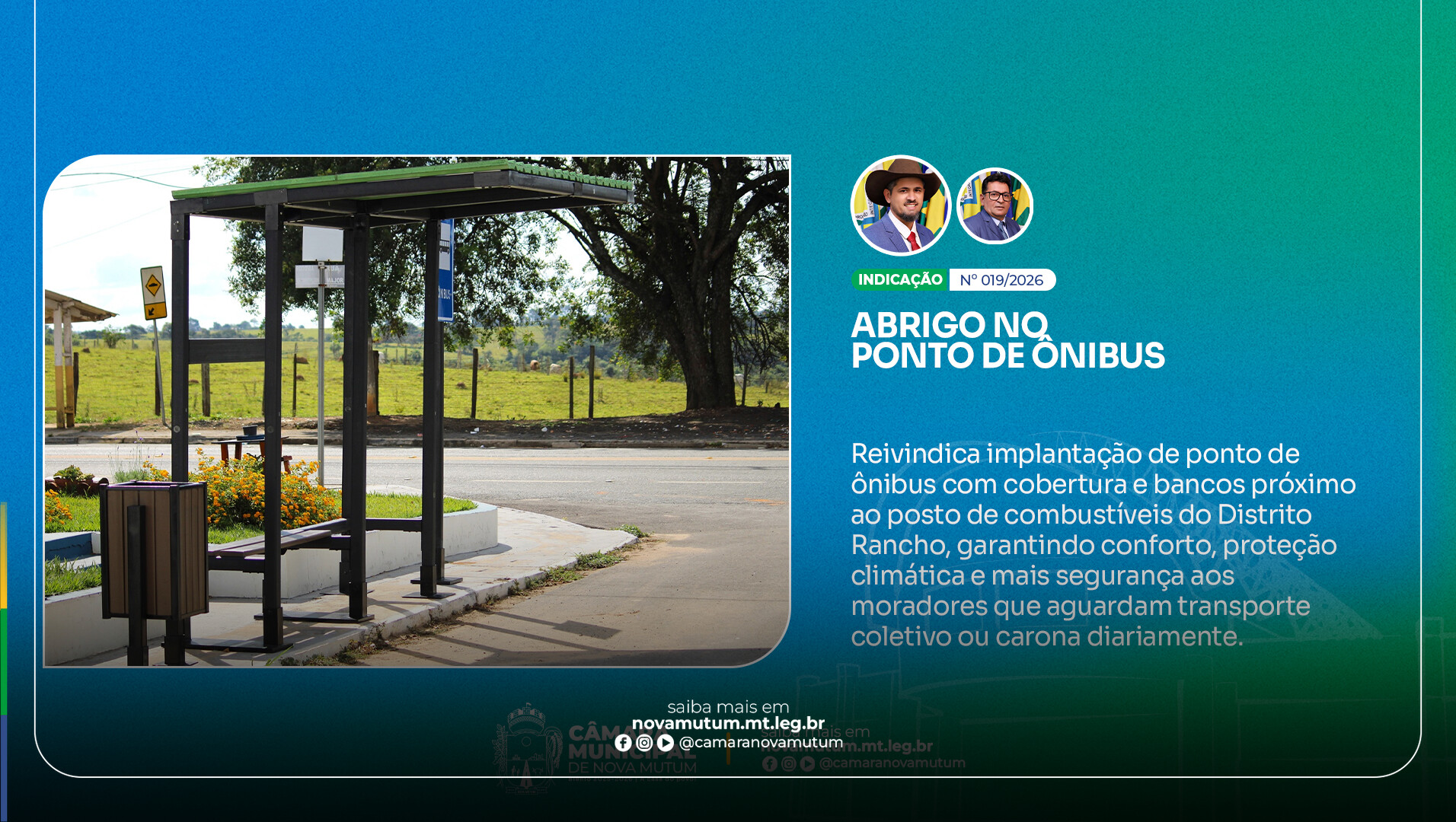 Durante sessão ordinária, foi apresentada a Indicação nº 019/2026, de autoria do vereador CRISTIANO BICÔ (REPUBLICANOS), com coautoria do vereador BAGUNCINHA (PP), propondo ao Poder Executivo, por meio do Departamento de Trânsito, a implantação e construção de um ponto de ônibus com cobertura e bancos no Distrito Ranchão.